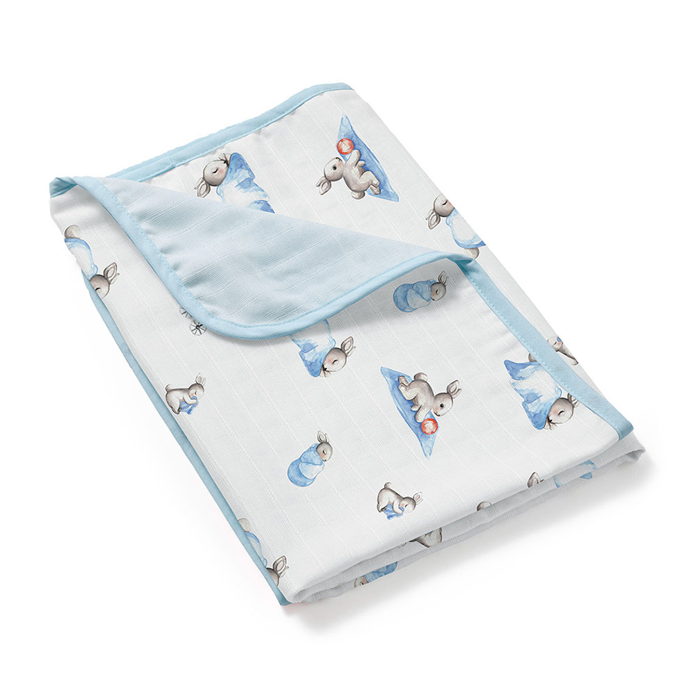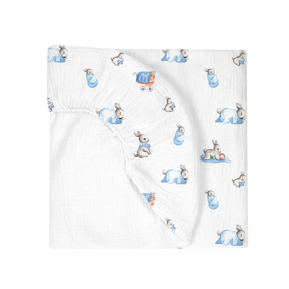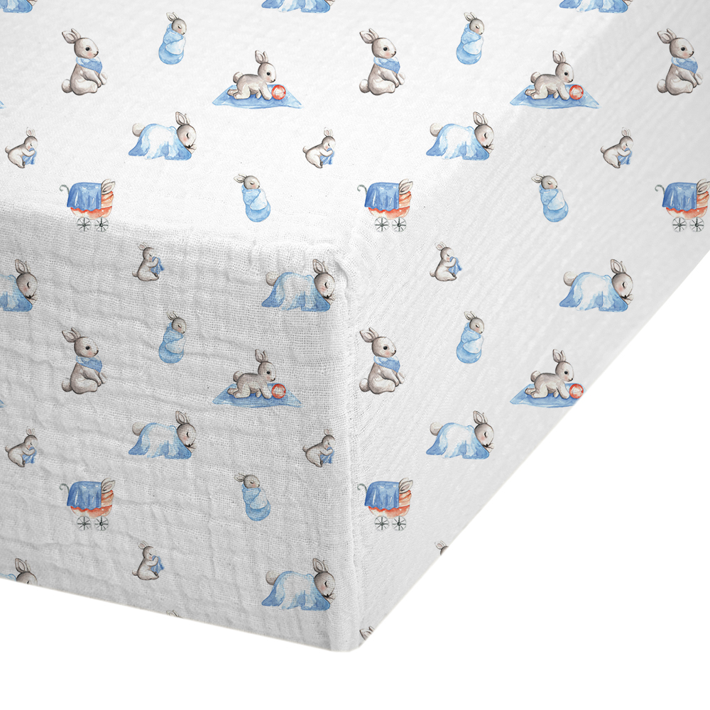 Muslin Fitted Cot Sheet UK | Blue Bunny Print | 70×140 cm | Deux Lapins